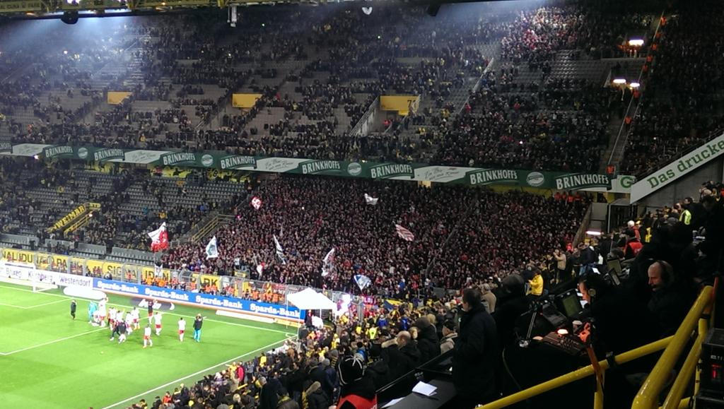 Auf der Nordtribüne selbst war zumindest der Stehblock 61 hoffnungslos überfüllt. Wie es in weiteren Blöcken aussah, kann ich nicht beurteilen. Der Zugang in den Block war völlig dicht, es ging weder vor, noch nach links, noch nach rechts. Den Leipzigern, die die Verhältnisse zu Hause in Sektor A und gerade in den engen Stellen im Unterrang nahe den Imbissständen ansatzweise kennen, sei hier versichert, dass im Vergleich zum Zugang in den Dortmunder Stehplatzbereich hier geradezu luxeriöse Platzverhältnisse herrschen. Ich habe nach dem Spiel mehrfach gehört, dass etliche Leute nicht mehr in den Block gekommen sind.