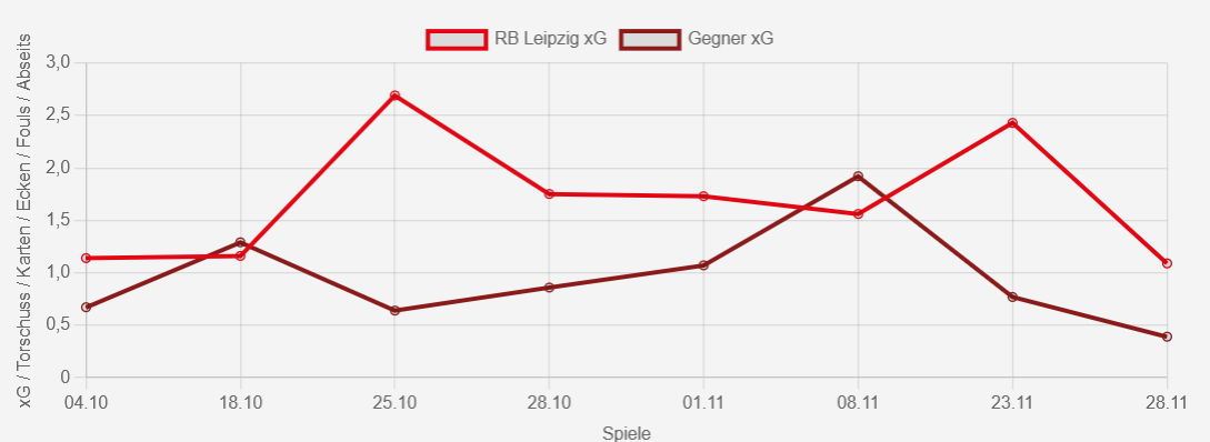 Ein durchwachsener November ist beendet. Nur ein Ligaauswärtssieg seit Ende September deutet ein wenig eine Leipziger Auswärtsproblematik an. In den Heimspielen ist RBL dagegen noch ohne Punktverlust und das soll auch gegen den FCM so bleiben. Seit Anfang Oktober konnte RBL nur gegen Augsburg und Werder über 2 xG erspielen und auch nur in diesen Begegnungen über einen xG Differenz erzielen. Das bedeutet, dass die Begegnungen zwar oft eine Tendenz zu Leipzigs Gunsten haben, diese aber nur selten zwingend genug für einen Sieg ist. Auch gegen Gladbach war Leipzig zwar spielbestimmend, blieb aber zu ungefährlich und hatte Glück, dass es heutzutage den VAR gibt, denn die Entscheidungen waren zwar beide final korrekt, aber initial falsch.