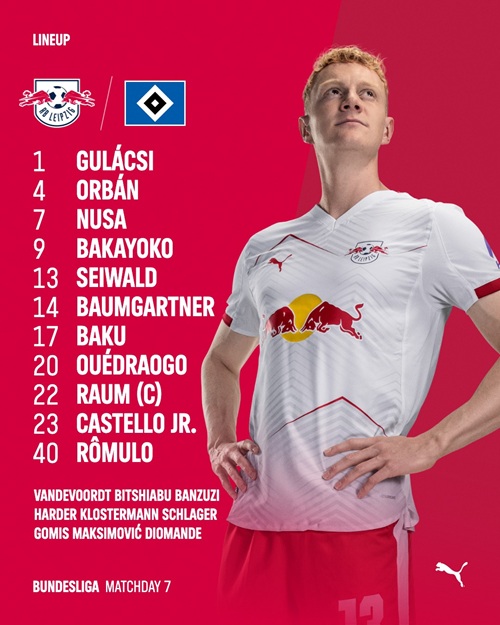 RB Leipzig: Gulácsi – Baku, Orbán, Lukeba, Raum (C) – Ouédraogo (67. Banzuzi), Seiwald, Baumgartner – Bakayoko, (89. Harder) Rômulo, (90+3. Maksimović), Nusa (67.Diomande)